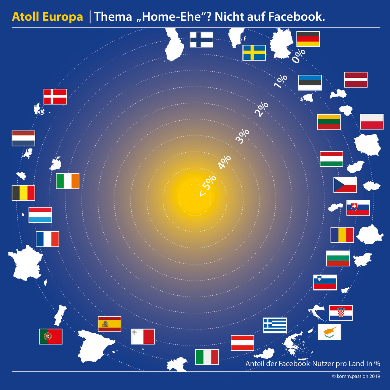 Bei den polarisierenden Themen „Homosexualität“ und „Ehe für alle“ wird es noch deutlicher. Die Spitzenwerte erreichen die Slowakei mit gerade einmal 1,25 Prozent der Facebook-Nutzer und Irland mit 1,13 Prozent. Weder in Staaten wie Irland, in denen die Ehen zwischen homosexuellen und heterosexuellen Paaren gleichgestellt sind, noch in solchen wie der Slowakei, in denen sich die Politik weiterhin verweigert, gleichgeschlechtliche Partnerschaften anzuerkennen, findet bei Facebook eine lebhafte Diskussion statt. So schenken dem Thema in Dänemark, dem weltweit ersten Land mit eingetragenen Lebenspartnerschaften, nur 0,09 Prozent der Nutzer – weniger als 4.000 von 4,1 Millionen nationalen Facebook-Usern – ihre Aufmerksamkeit. Gleichzeitig aber auch in einem Land wie Polen, das bis heute die gleichgeschlechtliche Partnerschaft in keiner Weise anerkennt, ebenfalls nur 0,09 Prozent.