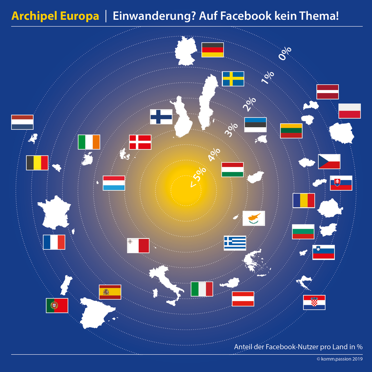 Die sogenannte „Flüchtlingskrise“ ist noch nicht allzu lange her. Im Facebook-Netz spielt sie nur eine untergeordnete Rolle. In Deutschland diskutieren gerade 1,11 Prozent der Nutzer über Einwanderung und die Einwanderungspolitik. Ähnlich in Frankreich mit 1,29 Prozent. In unseren Nachbarländern, den Niederlanden und Polen, sind es sogar nur 0,38 beziehungsweise 0,36 Prozent – und damit die wenigsten Facebook-Nutzer in der gesamten EU. Dabei fährt vor allem Polens Politik einen sehr harten Kurs in der Einwanderungspolitik. Nur in wenigen EU-Staaten – mit Dänemark, Finnland, Malta, Ungarn und Zypern gerade einmal fünf – beschäftigt das Thema mehr als drei Prozent der Nutzer. Eine geringe Zahl, bedenkt man, dass beispielsweise Malta und Zypern direkte Anlaufstellen für Flüchtlingsboote darstellen und beide Länder im Verhältnis zu ihrer Einwohnerzahl überdurchschnittlich viele Flüchtlinge aufgenommen haben.