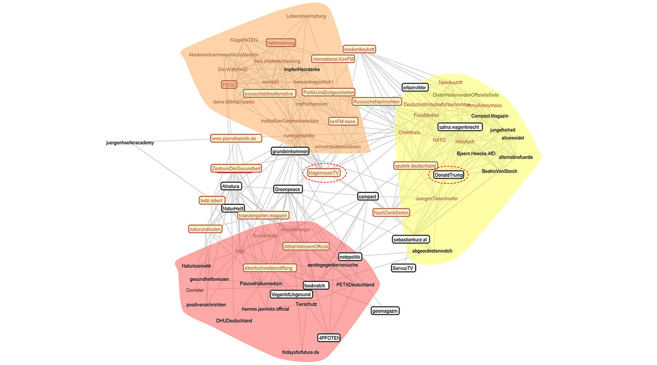 - hat das gesamte „Störsender-Cluster mit russischen Einflüssen“ deutlich an Relevanz gewonnen, z. B. einen Zuwachs bei „chemtrails“ von 25 Prozent, bei „Widerstand 2020“ („Deine Mitmach-Partei“) ein Plus von 36 Prozent. Die Ergebnisliste hat zudem neue und radikalere Entitäten erfasst, wie z.B. klagemauer.TV.