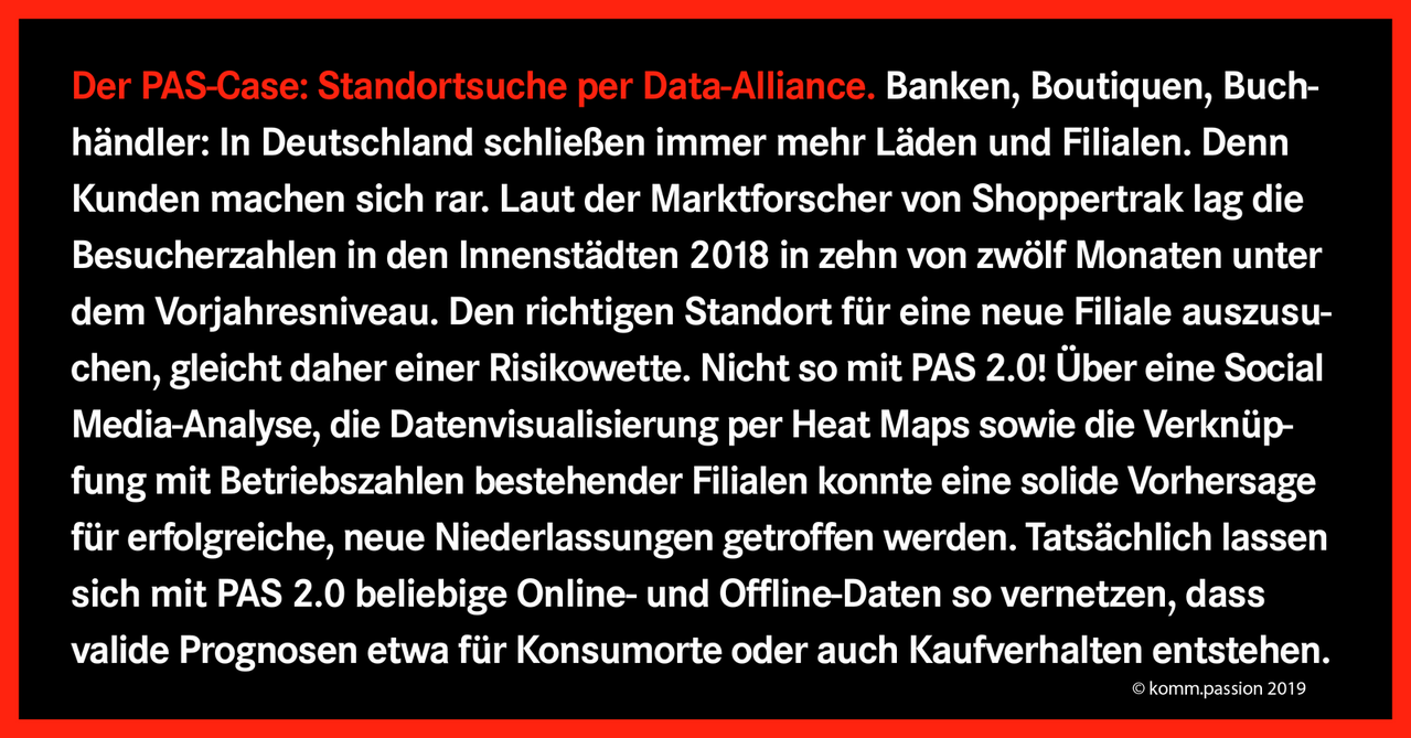 Auch wenn Verbraucher davon laut der IT-Marktbeobachter von IDC „nur“ rund 20 Prozent einspeisen, der Rest kommt von Unternehmen, steht fest: Ohne Künstliche Intelligenz (KI) werden sich Marketing-Kampagnen kaum noch planen, umsetzen, steuern lassen. Denn Monitoring und Analyse von Abermillionen neuen Bildern, Texten, Videos sind manuell schlicht nicht machbar. Die Digitalwerber von komm.passion haben das längst erkannt und PAS 2.0 geschaffen. Das Analyse-Werkzeug durchkämmt mit KI-Technologien hocheffizient Userdaten in sozialen Netzen. PAS wird schon seit einigen Jahren von großen Unternehmensberatungen oder auch internationalen Marken genutzt. Zielgruppen-Projekte liefen in China, Frankreich oder auch in Osteuropa.