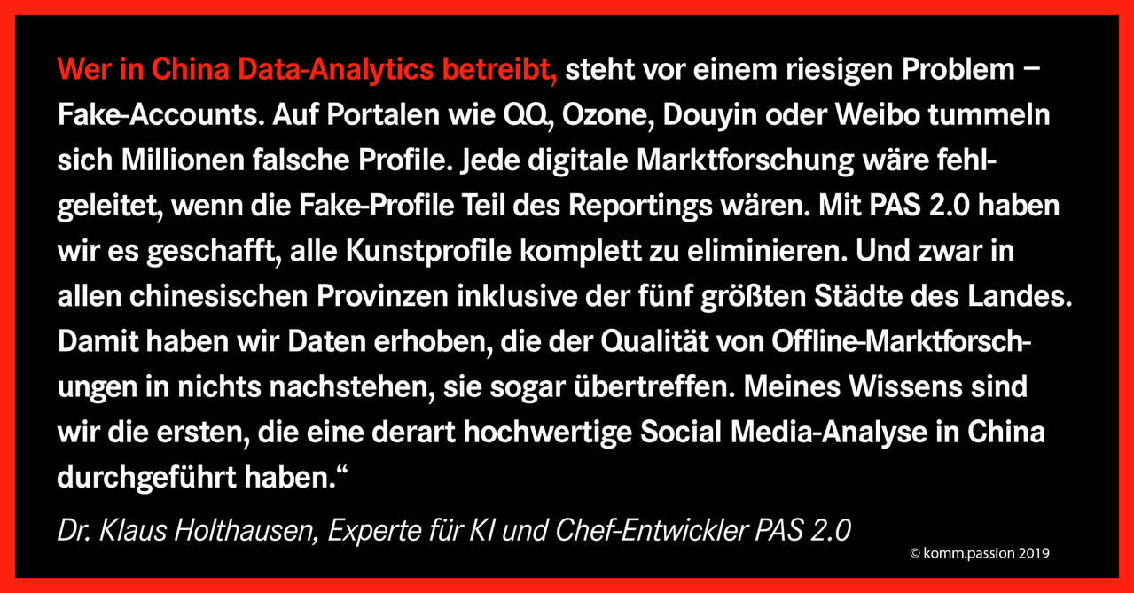 „Unsere PAS-Projekte in China oder auch Frankreich belegen: Moderne digitale Kampagnen werden nicht mehr vom Gefühl getragen, ob Visuals und Tonalität die Rezipienten ansprechen. Nein, wir dekodieren Klicks, Likes, Smileys, Kommentare und geben sehr genaue Einblicke in die Gefühls- und Entscheidungswelt der Zielgruppen“